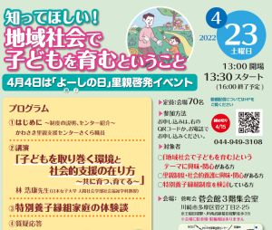 4月23日(土)川崎市多摩区で開催される「養子の日」里親啓発イベントの締め切り日を4月20日までに延長しました!