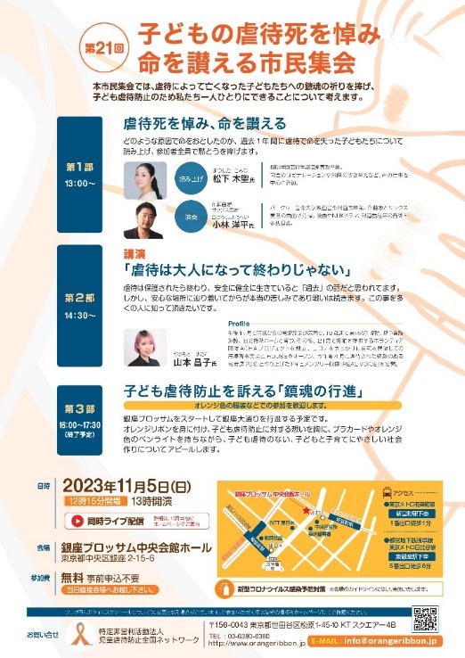 11/5「第21回 子どもの虐待死を悼み 命を讃える市民集会」が開催されます