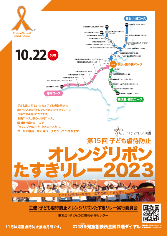 かわさき里親支援センターさくらがある川崎市では、10/22(日)にオレンジリボンたすきリレーが開催されます。川崎コースは、麻生区にある白山愛児園と、多摩区にある至誠館さくら乳児院をスタートし、ゴールの横浜・象の鼻パークを目指します。