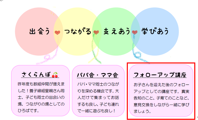 川崎市の養子縁組里親に登録していて、川崎市の児童相談所から委託を受けた養子縁組家庭を対象とした講座です。