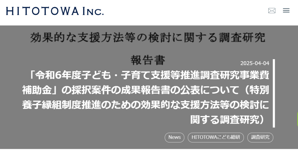 株式会社HITOTOWAさん( https://hitotowa.jp/ )が実施された『特別養子縁組制度推進のための効果的な支援方法等の検討に関する調査研究』の調査にセンターさくらも協力させていただききました。