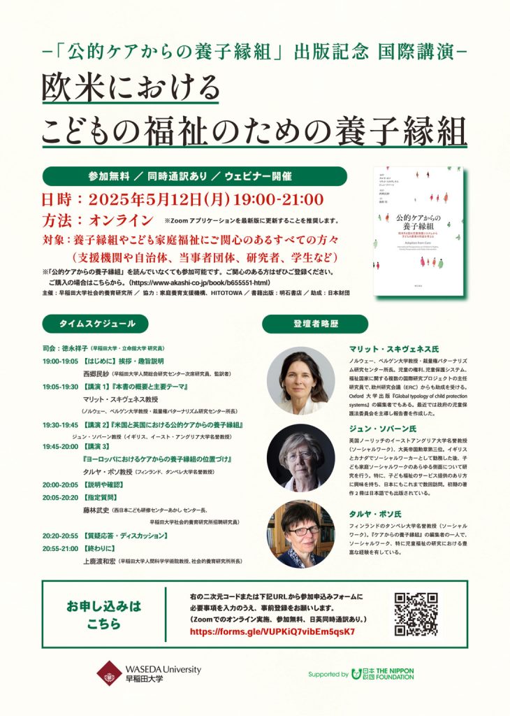 養子縁組や子ども家庭福祉にご関心のある方を対象とした講演のご案内です。