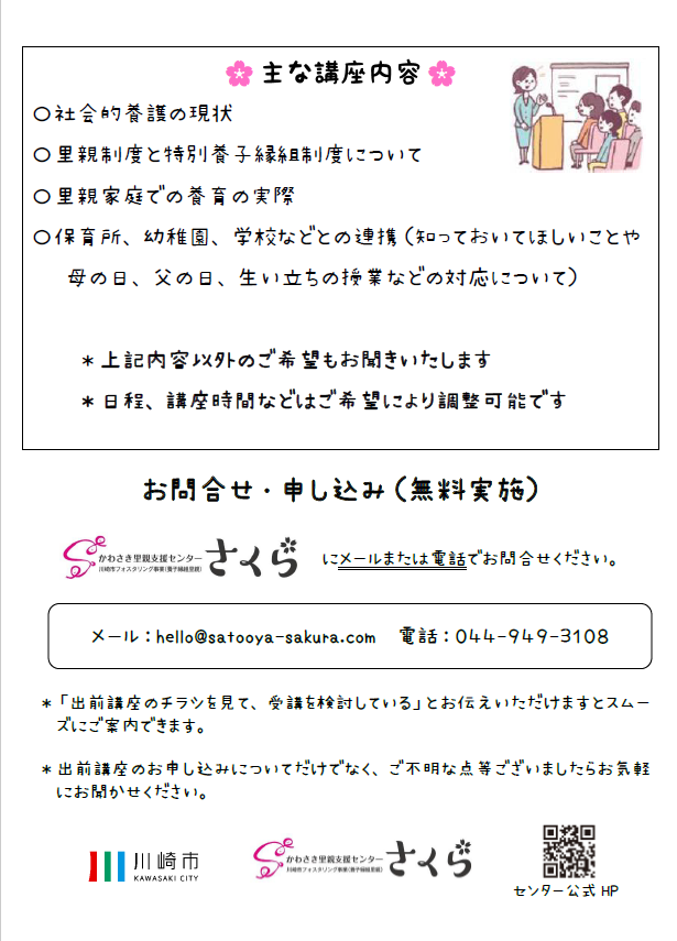 - 講座の内容、日程、講座時間などについてきましては、ご希望により調整可能です。