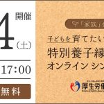 2023年1月28日 / 最終更新日時 : 2023年1月28日 pen-sako103 お知らせご紹介「朝日新聞社 子どもを育てたいと願う人へ」 2023年2月4日(土)14:00~17:00朝日新聞社主催の「特別養子縁組制度オンラインシンポジウム」 が開催されます。参加費無料・申込み締め切りは2/3(金)です。 特別養子縁組制度とは、様々な事情により生みの親の元 […]