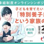 2022年1月22日 / 最終更新日時 : 2022年1月22日 pen-sako103 お知らせ厚生労働省主催「特別養子縁組制度オンライン・シンポジウム」ご案内 令和4年2月5日(土)14:00~16:30厚生労働省主催の特別養子縁組制度オンライ・シンポジウムを開催されます。 <シンポジウム概要> 当事者が語る『特別養子縁組』~「私が母です」と言えるようになるまで~ 久保田智子さ […]